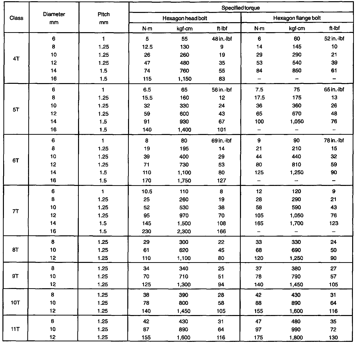 SPECIFIED TORQUE FOR STANDARD BOLTS: