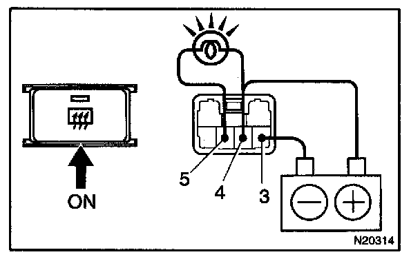 c. Push the defogger switch ON, check that the indicator light and test bulb light up for 12 to 18 minutes, then the indicator light and test bulb light goes out.