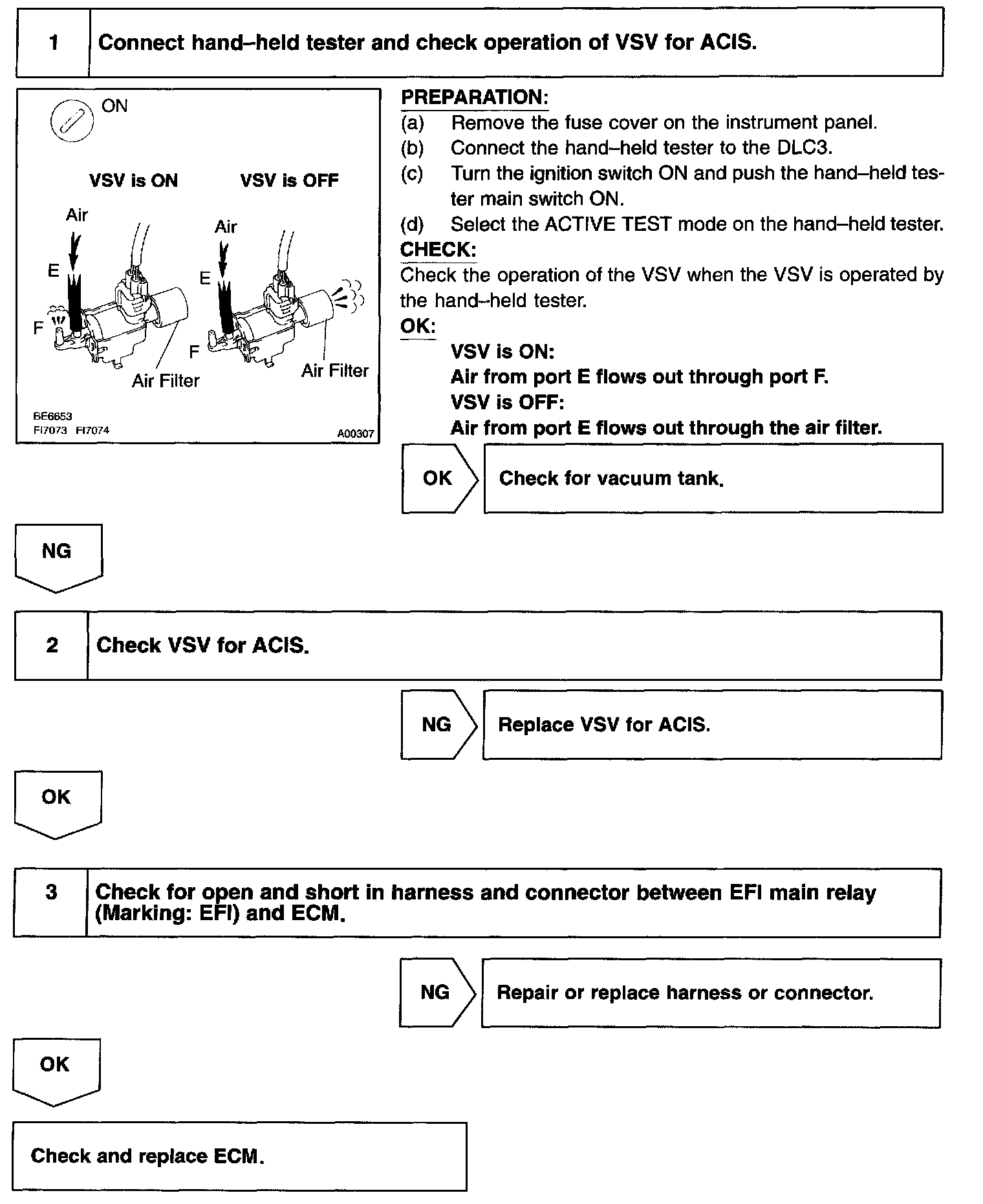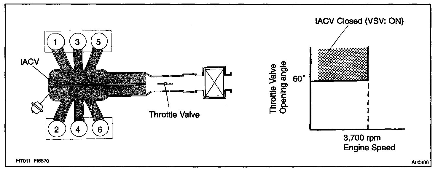 When the engine speed is 3,700 rpm or less and the throttle valve opening angle is 60 ° or more, the ECM turns the VSV ON and closes the IACV. At all the other time, the VSV is OFF and the IACV is open.