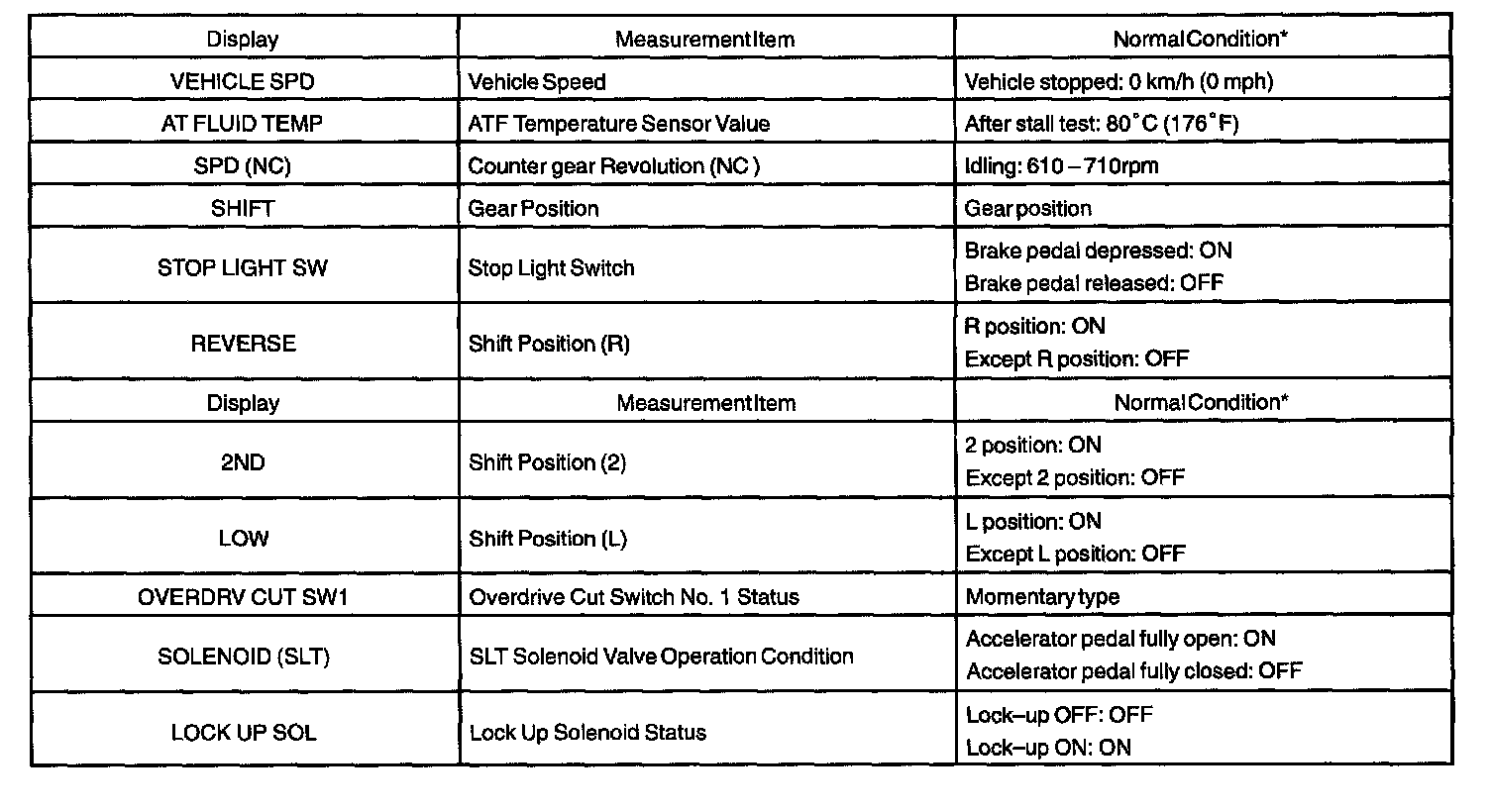 NOTE: The values given for "Normal Condition" are representative values, so a vehicle may still be normal even if its value varies differ from those listed here. So do not decide whether a part is faulty or not solely according to the "Normal Condition" here.