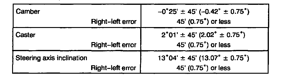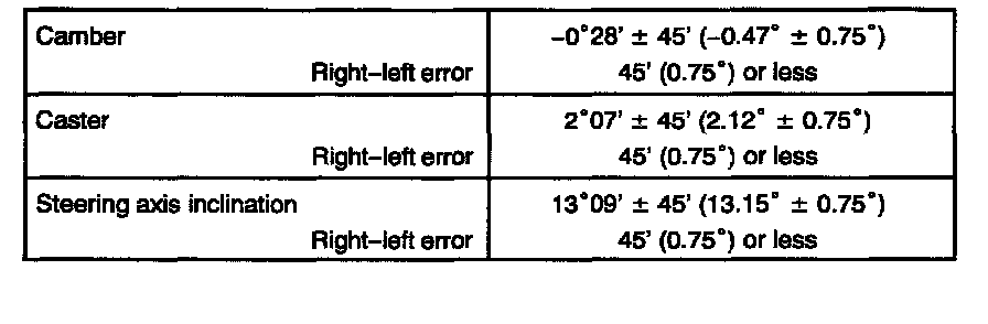 If the caster and steering axis inclination are not within the specified values, after the camber has been correctly adjusted, recheck the suspension parts for damaged and/or worn out parts.