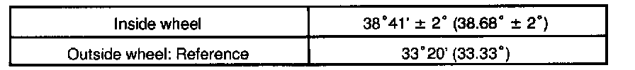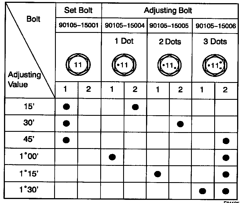 If the camber is not within the specified value using the following table, estimate how much additional camber adjustment will be required, and select the camber adjusting bolt.