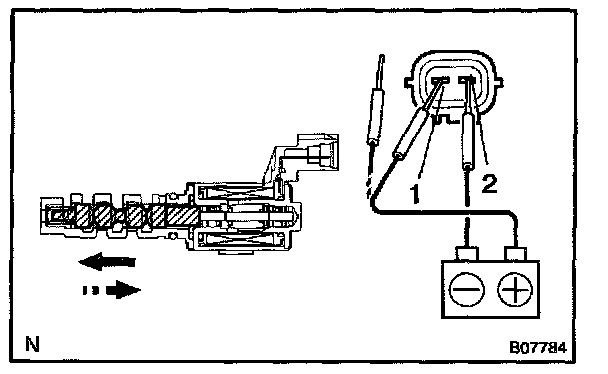 Connect the positive (+) lead from the battery to terminal 1 and negative (-) lead to terminal 2, and check the movement of the valve.