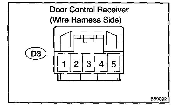 b. Check the continuity and voltage between the terminals of the door control receiver connector and the body ground, as shown in the illustration and table.