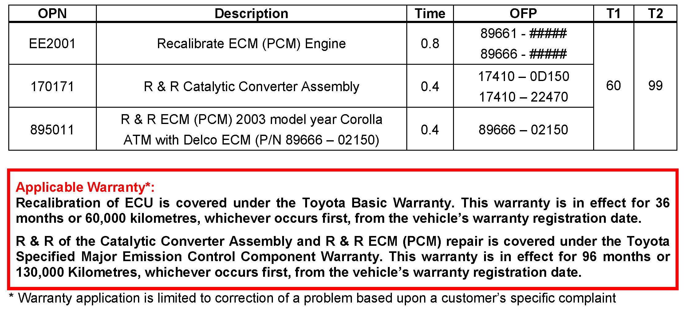 Some 2003 -- 2004 model year Corolla vehicles equipped with a 1ZZ--FE engine may exhibit a M.I.L. "ON" condition with Diagnostic Trouble Code P0420 (Catalyst System Efficiency below Threshold) stored in the Engine Control Module (ECM) (SAE term: Powertrain Control Module/PCM). Follow the repair procedure to reflash the ECM (PCM) and replace the catalytic converter assembly.