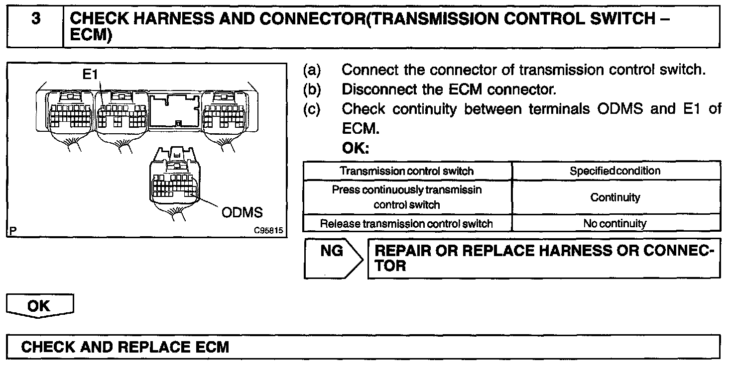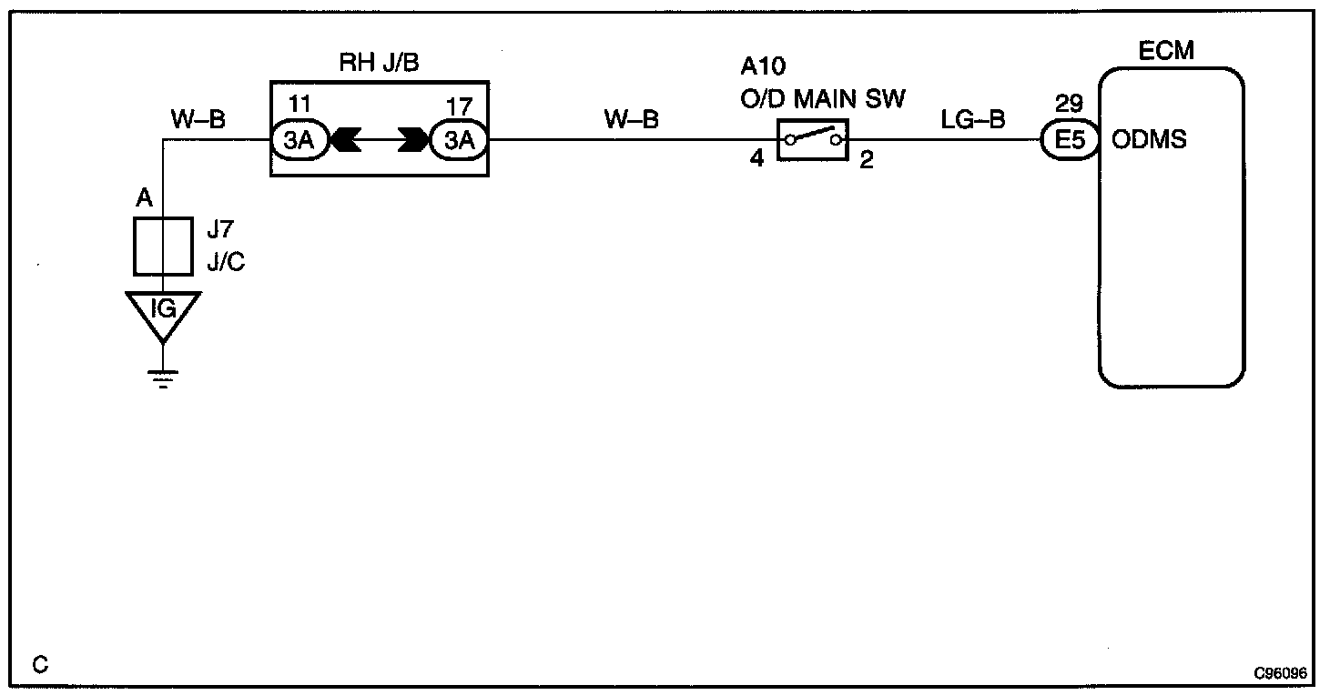 CIRCUIT DESCRIPTIONThe O/D main switch is a momentary type switch. When pressing the O/D main switch, the O/D OFF indicator light comes on and the ECM prohibits shifting into O/D, and when pressing it once again, the O/D OFF indicator light goes off and the ECM allows shifting into O/D. Turning the IG switch OFF will reset the O/D OFF indicator light.