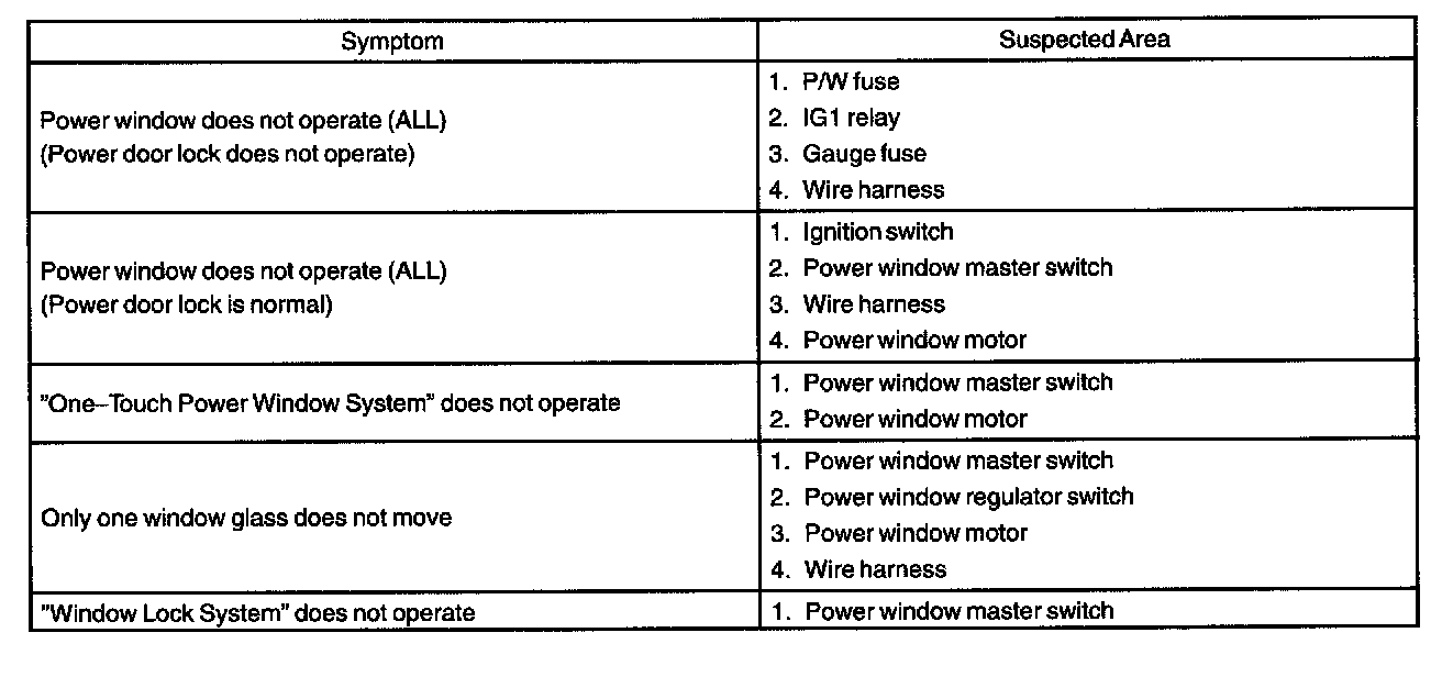 Power Symptoms Table - Power Window Control System: