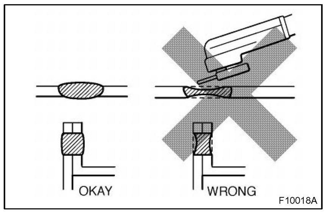 2. Plug welding should be done with a MIG (Metal Inert Gas) welder. Do not gas weld or braze panels at areas other than specified.