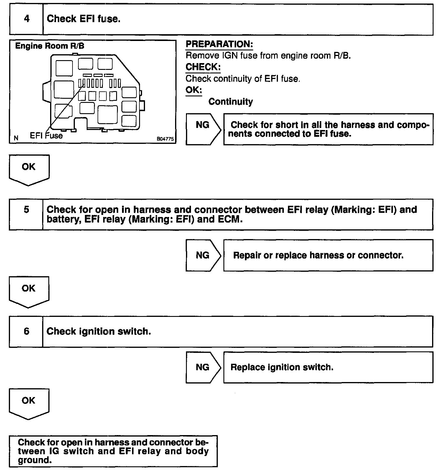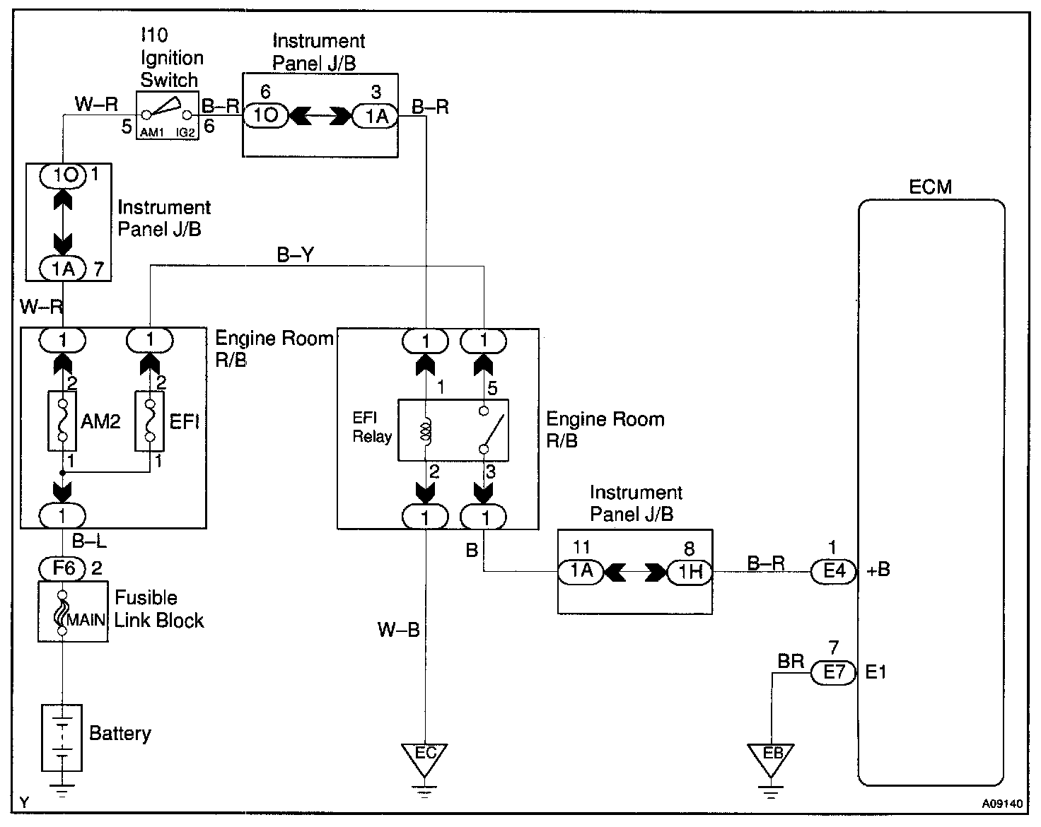 CIRCUIT DESCRIPTIONWhen the ignition switch is turned ON, battery positive voltage is applied to the coil, closing the contacts of the EFI main relay (Marking: EFI) and supplying power to terminal +B of the ECM.