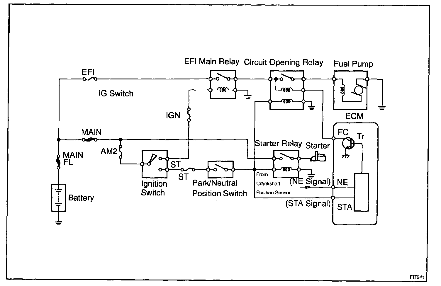 CIRCUIT DESCRIPTIONIn the diagram , when the engine is cranked, current the flows from terminal ST of the ignition switch to the starter relay coil and also the current flows to terminal STA of ECM (STA signal).