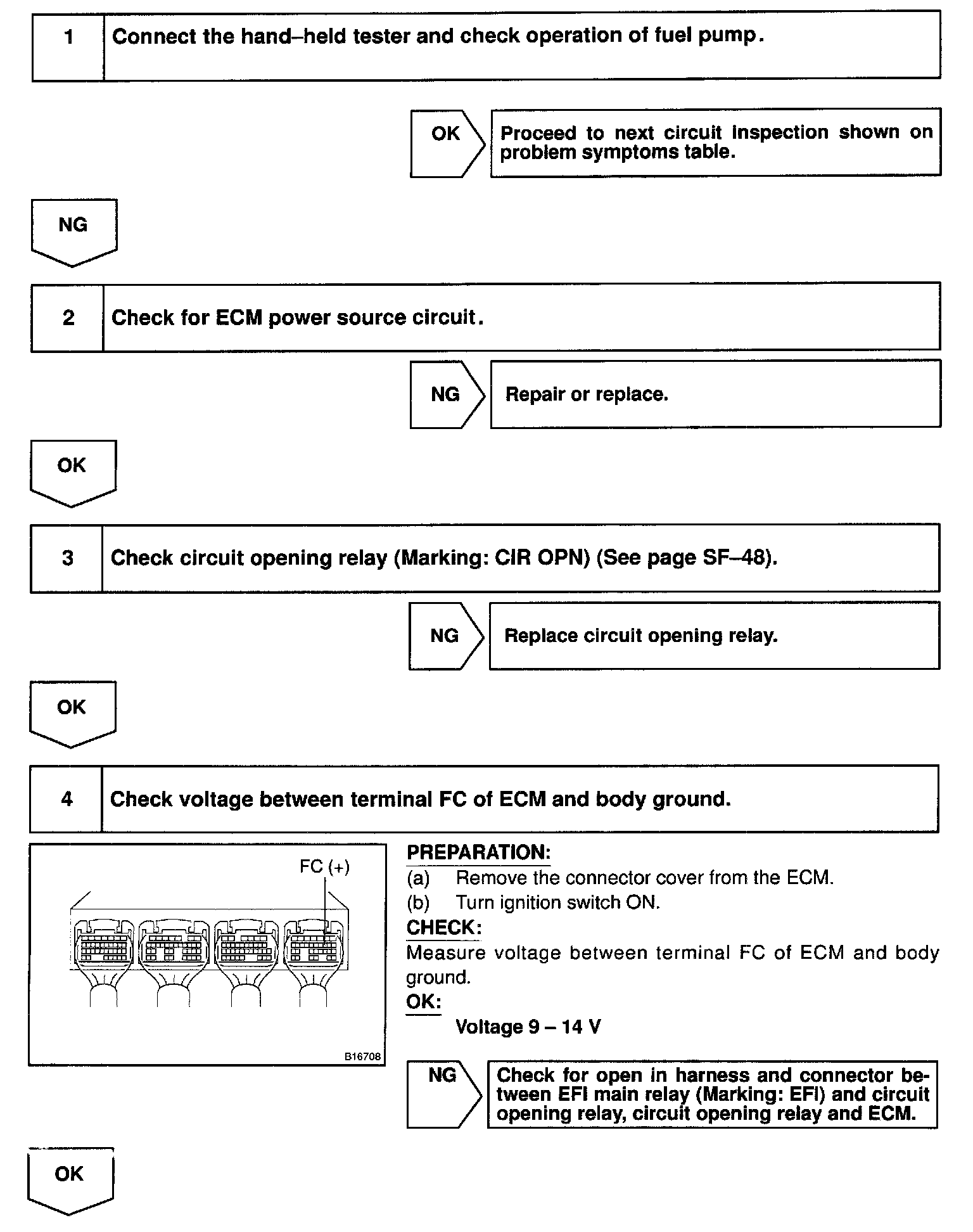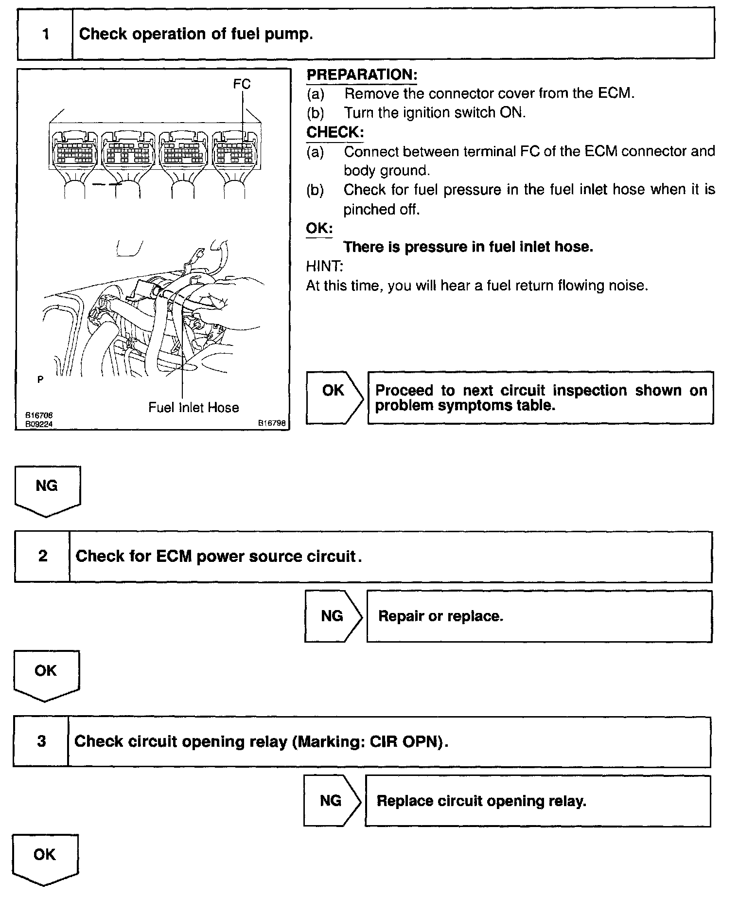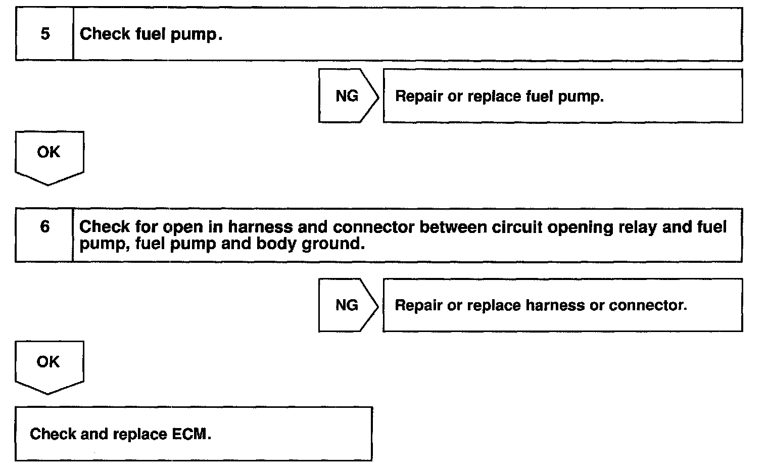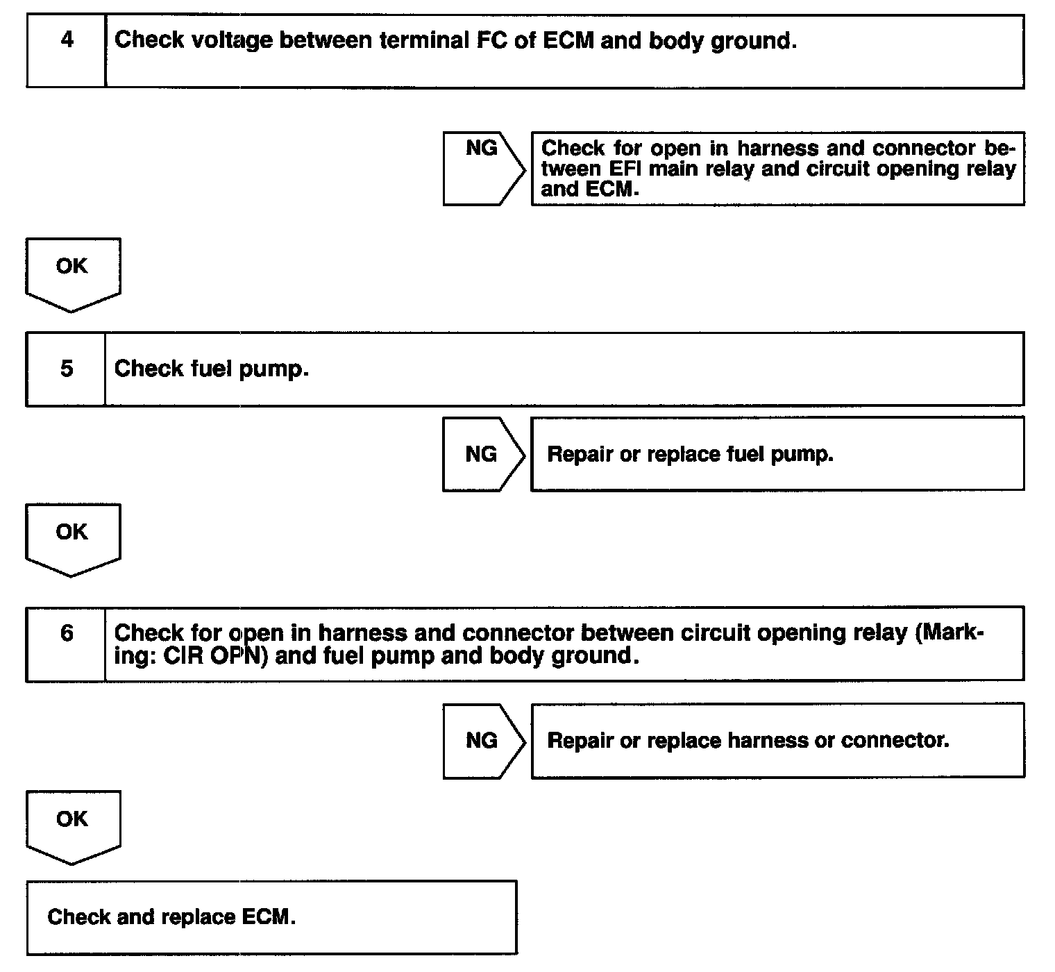 When the STA signal and NE signal are input to the ECM, Tr is turned ON, the current flows to the coil of the circuit opening relay, the relay switches on, power is supplied to the fuel pump and the fuel pump operates.