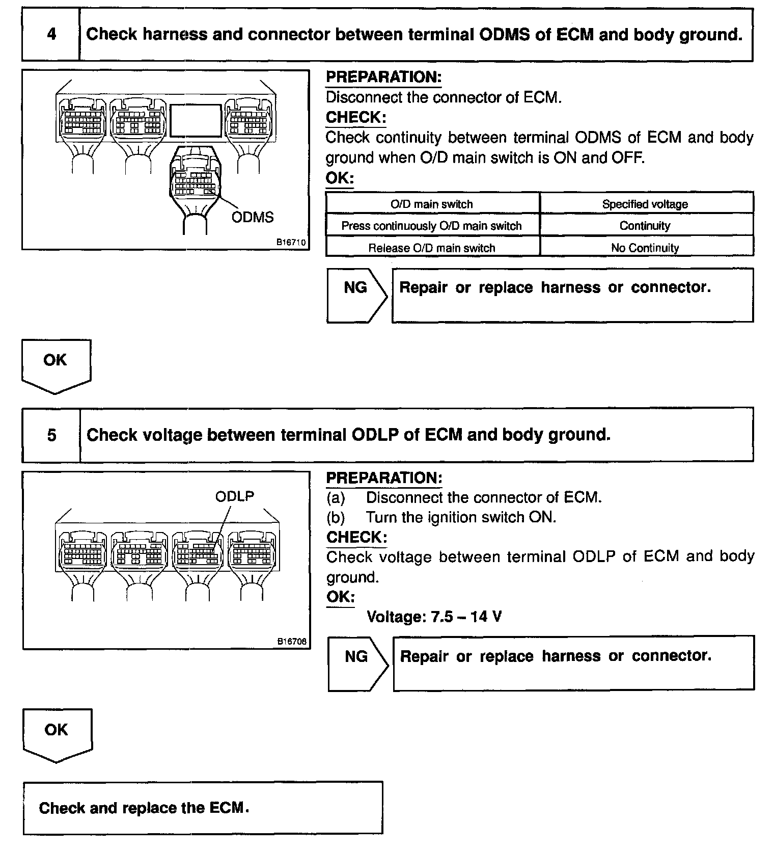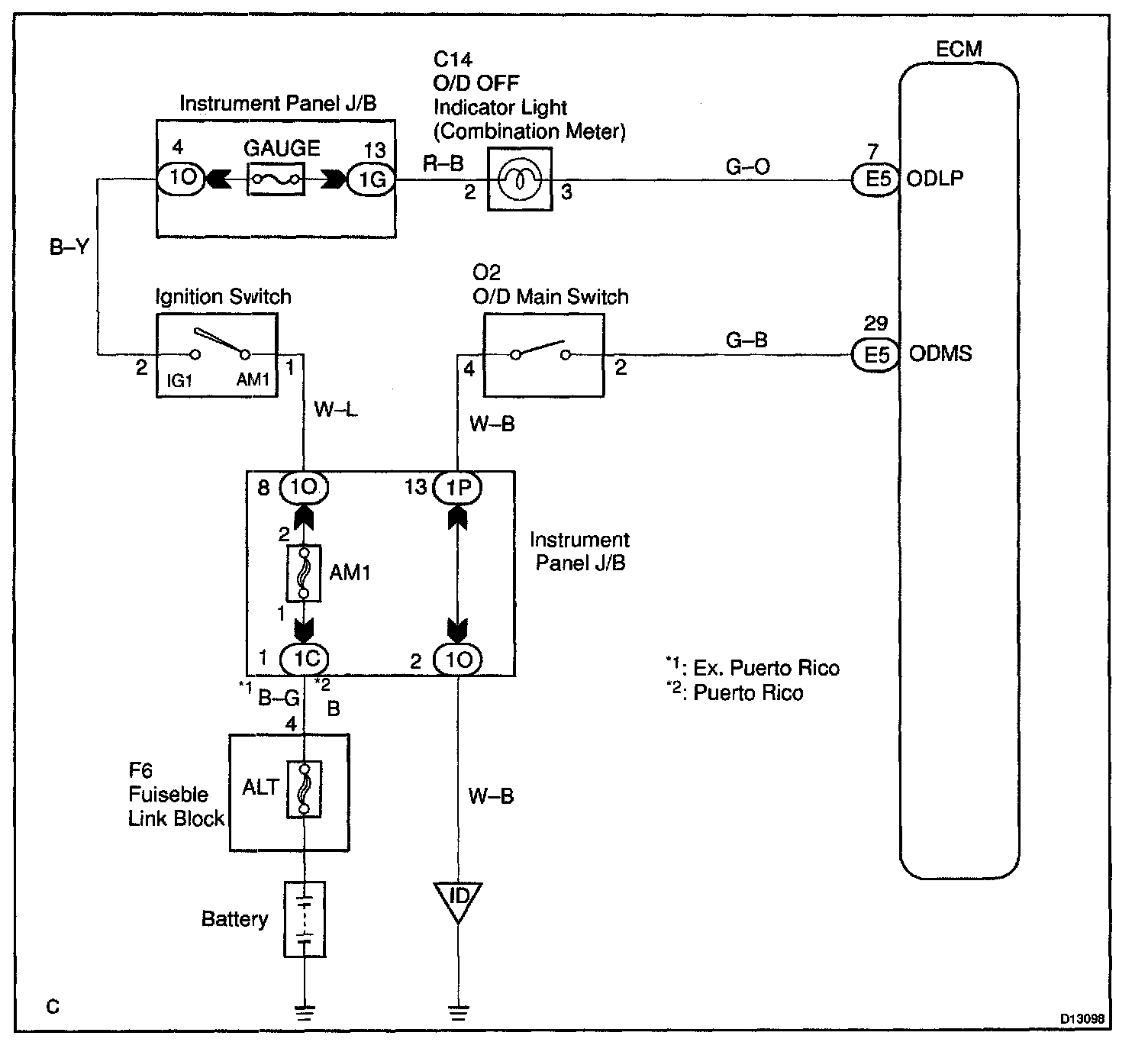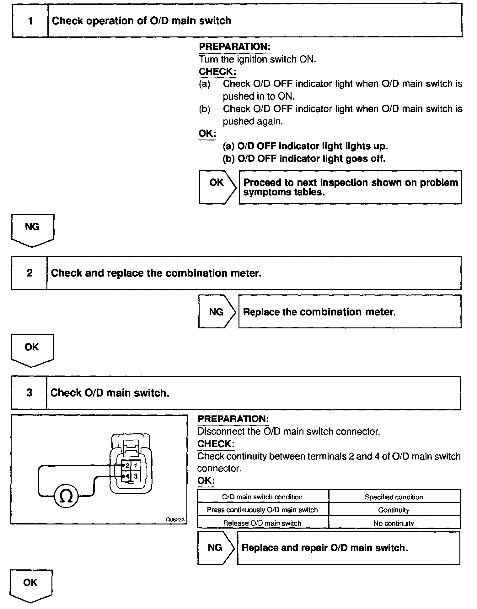 CIRCUIT DESCRIPTIONThe O/D main switch is a momentary type switch. When pressing the O/D main switch, the O/D OFF indicator light lights up and ECM prohibits shifting to O/D, and when pressing it again, the O/D OFF indicator light goes off and ECM allows shifting to O/D. Turning the IG switch OFF will reset the O/D OFF indicator light.