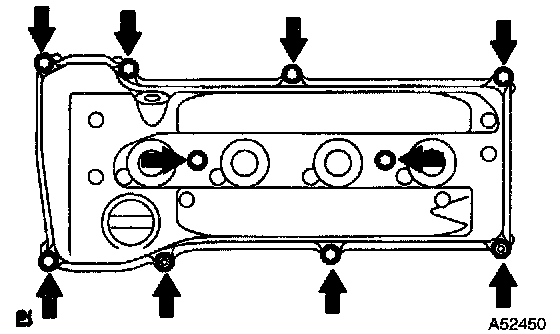 b. Remove the 8 bolts and 2 nuts, and disconnect the cylinder head cover.