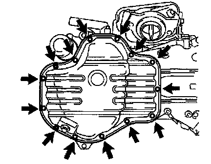 c. Install the oil pan with the 12 bolts and 2 nuts.