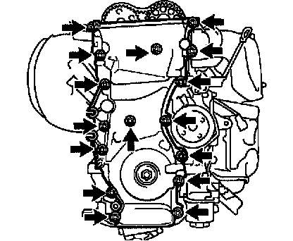 d. Install the timing chain cover with the 14 bolts and 2 nuts.