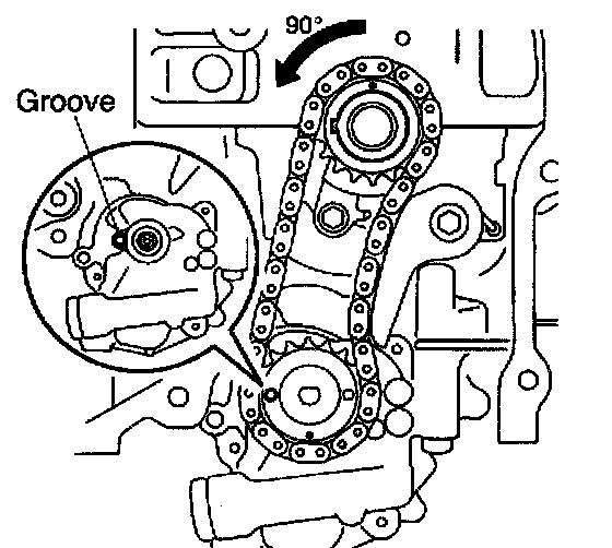 a. Turn the crankshaft counterclockwise by 90°, and align an adjusting hole of the oil pump drive shaft gear with the groove of the oil pump.