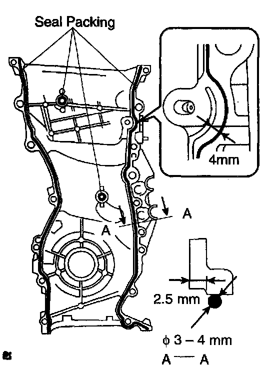 c. Apply seal packing in the shape of bead (Diameter 3 - 4 mm (0.118 - 0.157 inch)) as shown in the illustration.