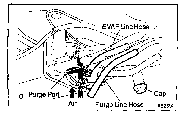 c. Pressurize 4 kPa (41 gf/sq.cm, 0.58 psi) to the purge port and check that there is ventilation through the EVAP line hose.