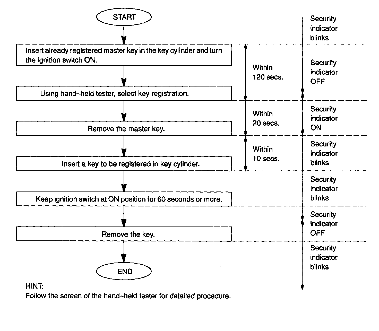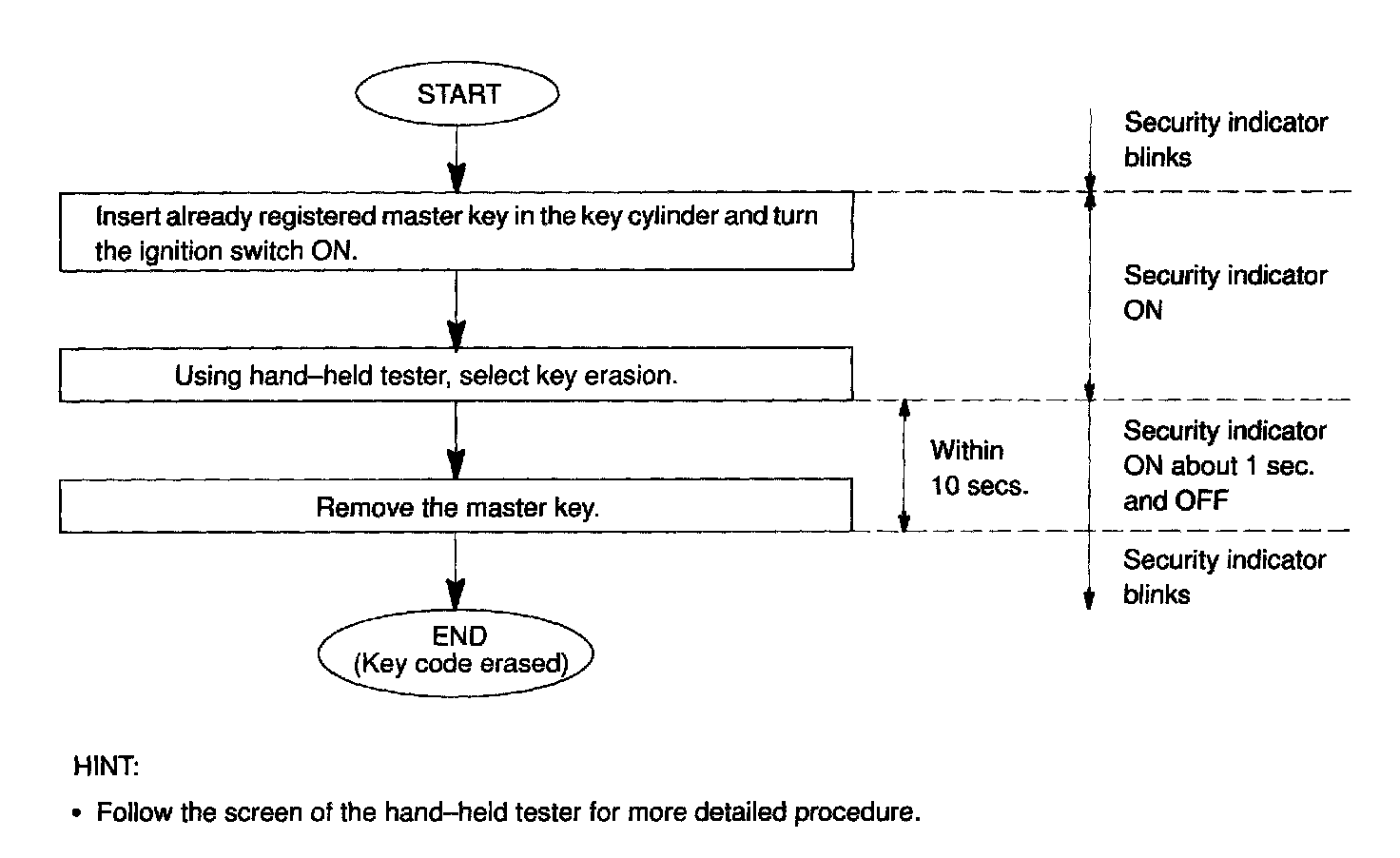 - When replacing "Ignition Cylinder Key Set" or "Lock Cylinder Set", perform registration following the procedure using the original master key. However, after the registration of the additional master key, as the original master key and the original sub-key is not necessary any more, erase registration of those key codes.