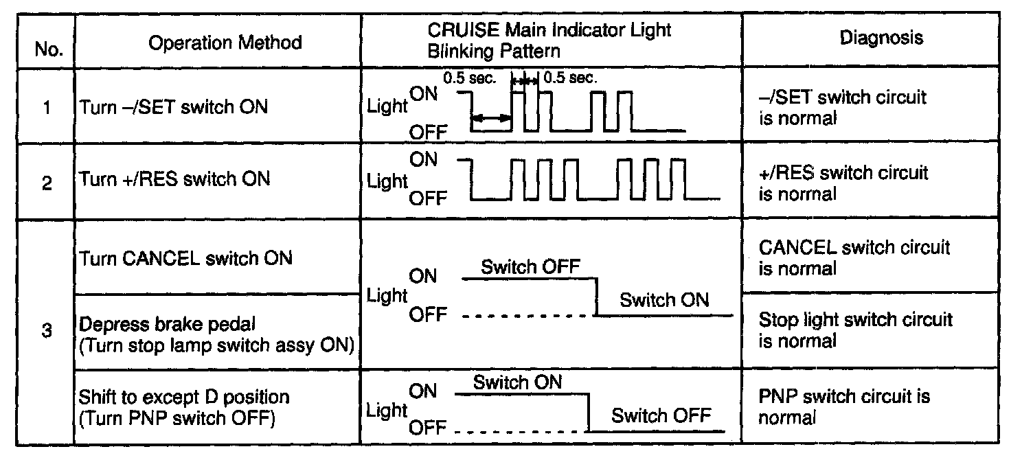 3. Check that the CRUISE main indicator light blinks twice or 3 times repeatedly after 3 seconds.