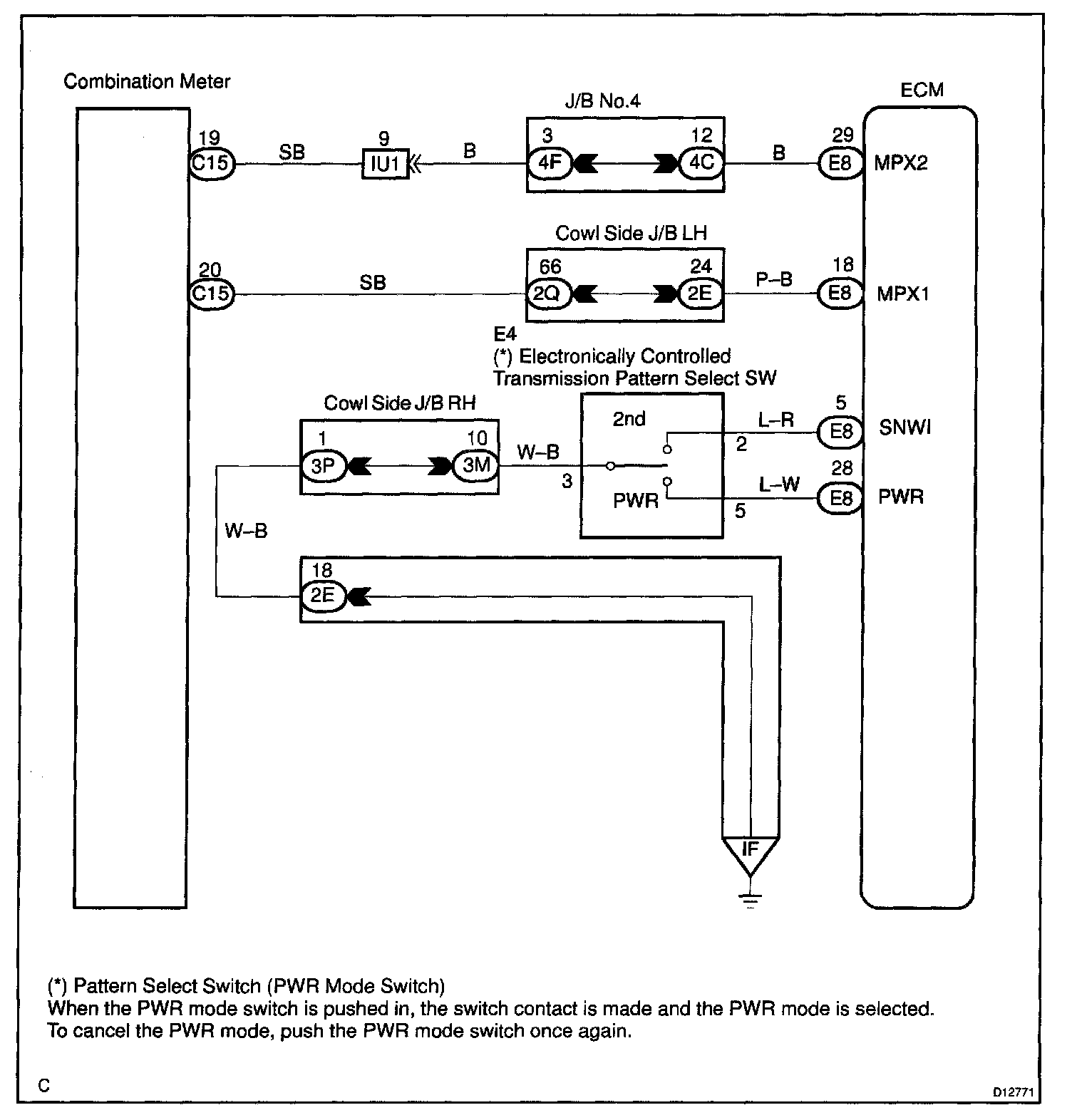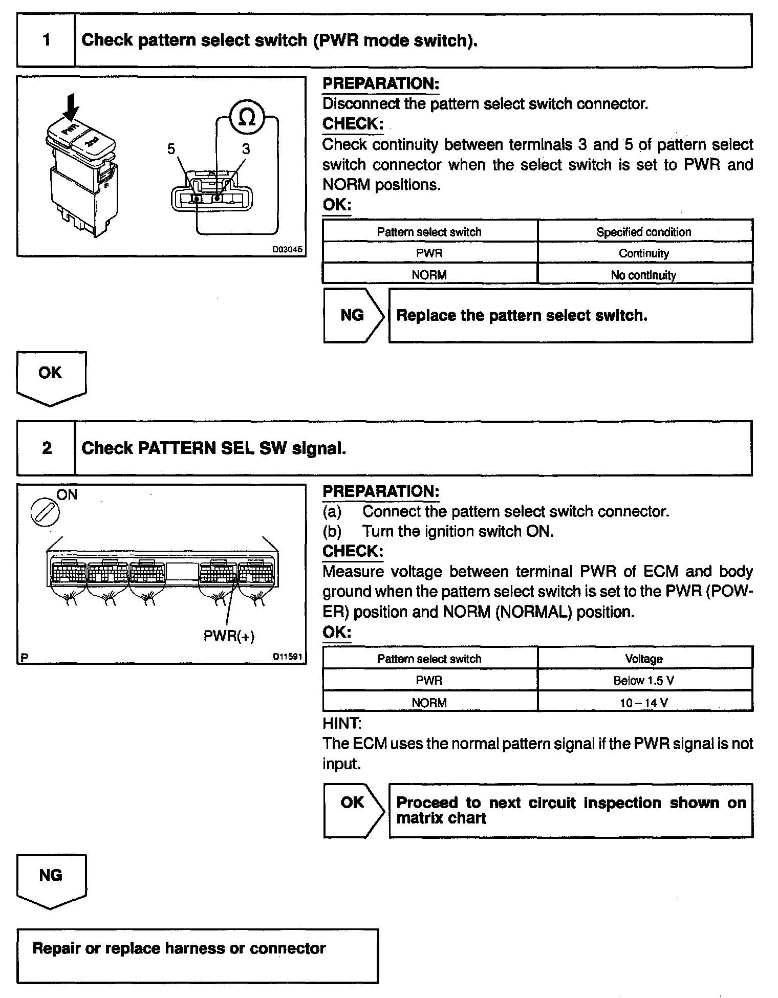 The ECM memory contains the shift programs for the NORMAL and POWER patterns, 2 position, L position and the lock-up patterns. Following the programs corresponding to the signals from the pattern select switch, the park/neutral position and other various sensors, the ECM switches the solenoid valves ON and OFF, and controls the transmission gear change and the lock-up clutch operation.