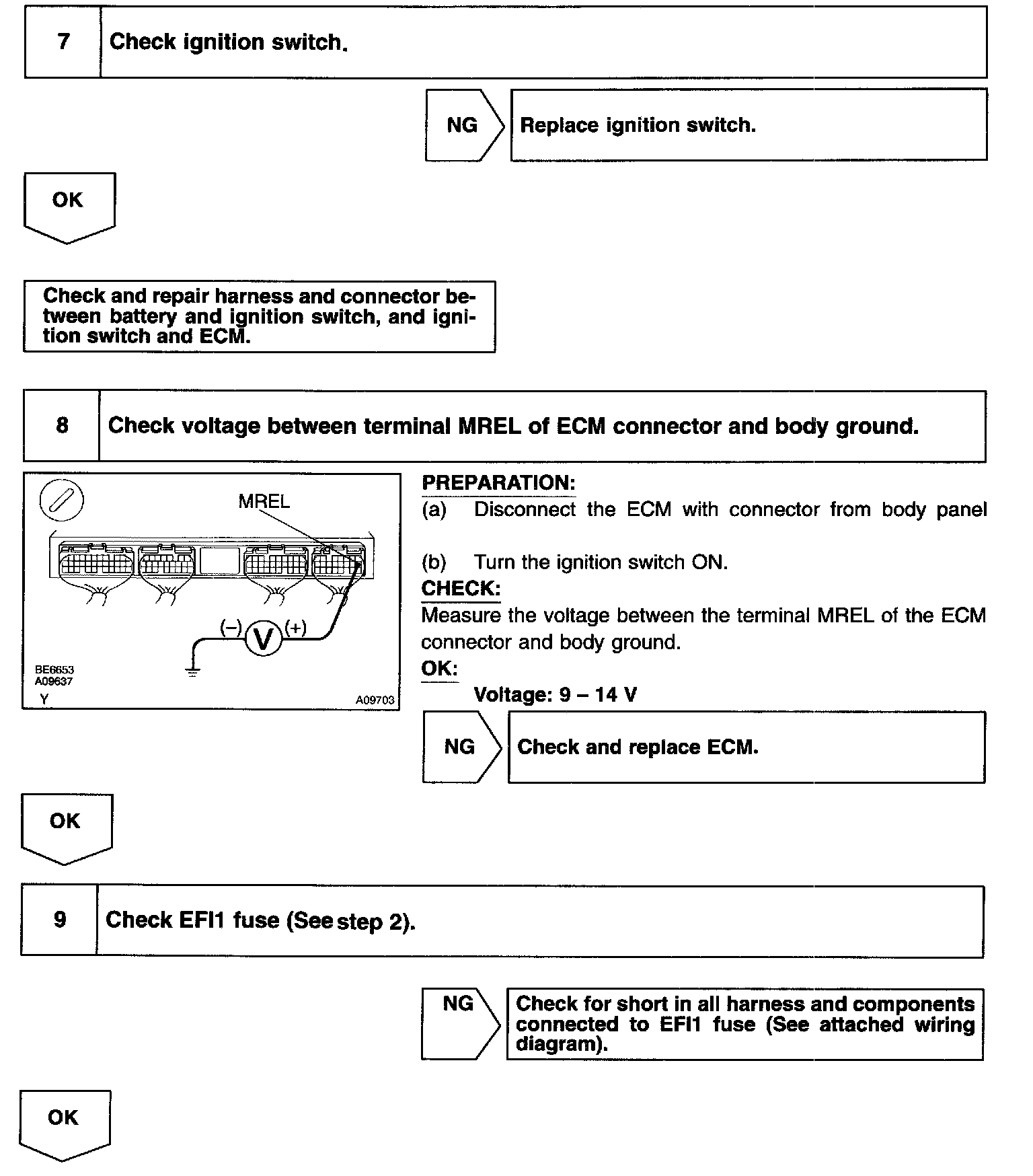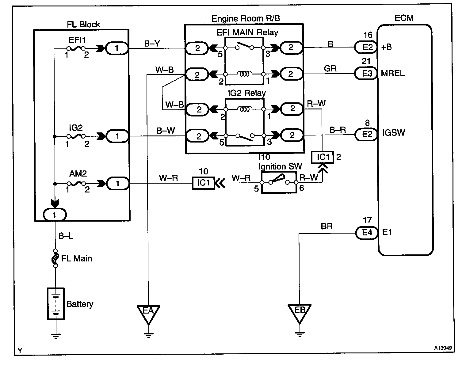 This signal causes current to flow to the coil, closing the contacts of the EFI main relay and supplying power to terminals +B of the ECM.