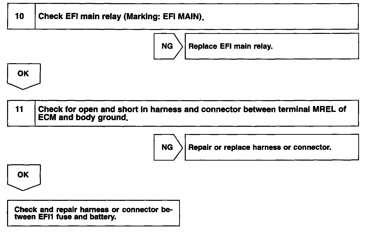 CIRCUIT INSPECTIONWhen the ignition switch is turned on, battery positive voltage is applied to IG2 Relay, terminal IGSW of the ECM and the EFI main relay (Marking: EFI MAIN) control circuit in the ECM sends a signal to terminal MREL of the ECM switching on the EFI main relay.