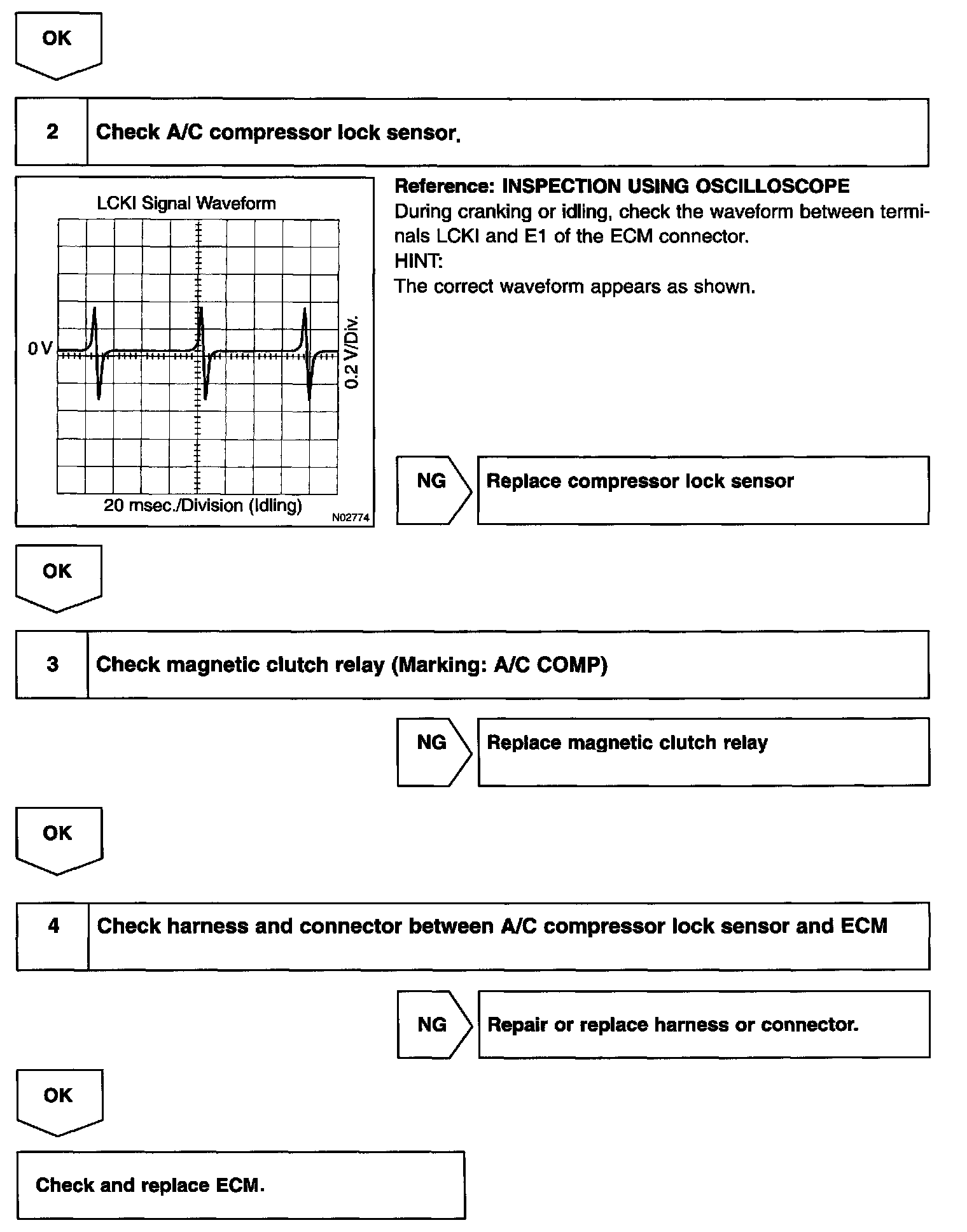 CIRCUIT DESCRIPTIONThis sensor sends 1 pulse per engine revolution to the ECM. It the number ratio of the compressor speed divided by the engine speed is smaller than a predetermined value, the ECM turns the compressor off. And, the indicator flashes at about 1 second interval.