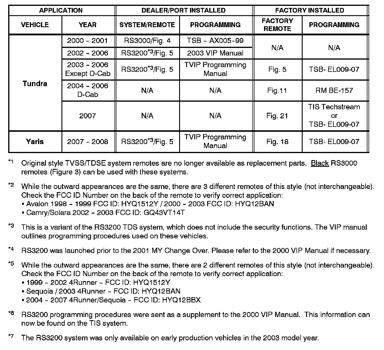 Difficulties during Remote Keyless Entry (RKE) Transmitter Programming can arise due to confusion between Toyota Factory Wireless systems and Toyota Port/Dealer installed systems. This bulletin will assist in identifying the system/correct remote transmitters for each vehicle, and provide the location of the most accurate programming procedure for each system.