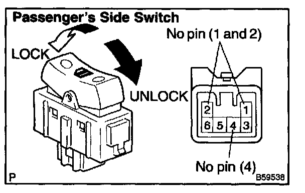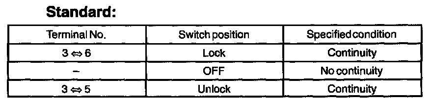 Inspect the door lock control switch continuity, as shown in the illustration and table.