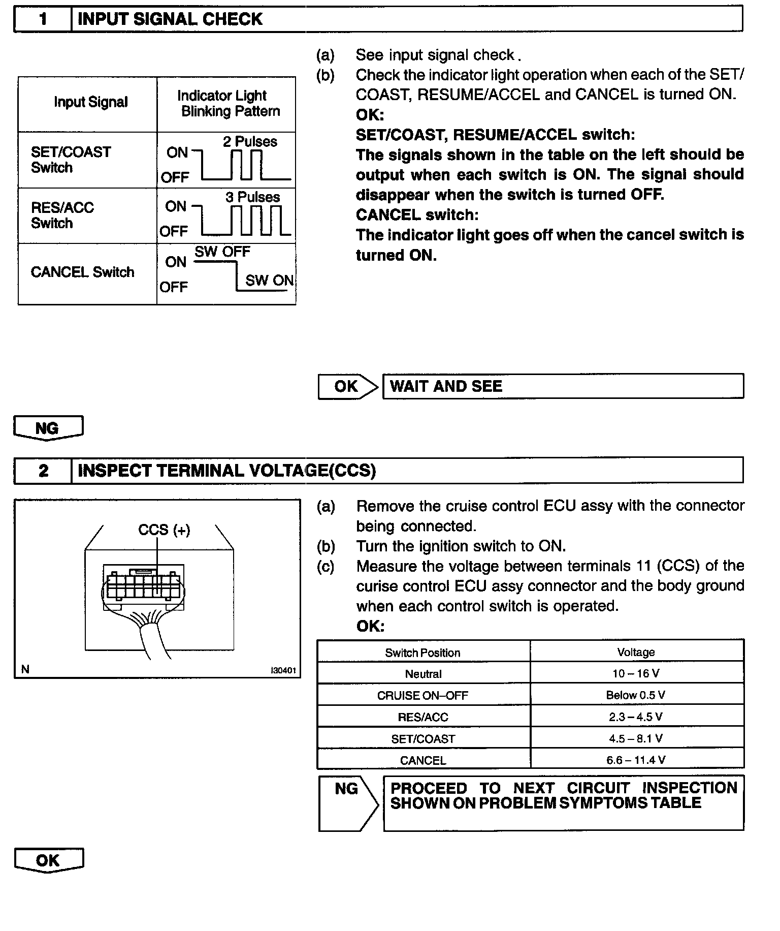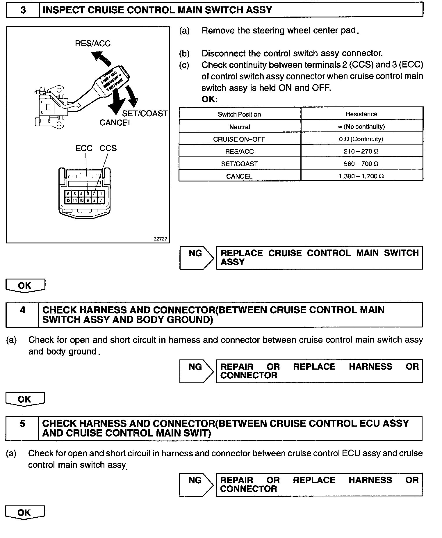This circuit carries the SET/COAST, RES/ACC and CANCEL signals (each voltage) to the cruise control ECU assy.
