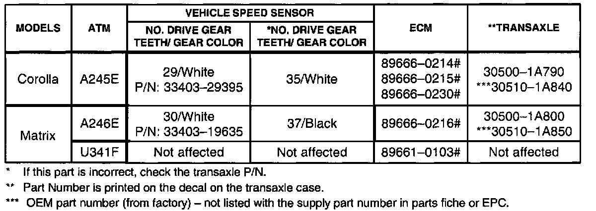 ^ 2003 model year Corolla & Matrix vehicles produced BEFORE the Production Change Effective VINs shown below.