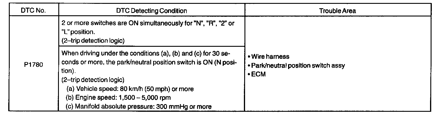 The park/neutral position switch detects the shift lever position and sends the signals to the ECM. The ECM receives the signals (NSW, R, 2 and L) from the park/neutral position switch when the signal is not sent to the ECM from the park/neutral position switch, the ECM judges that the shift lever is in the D position.