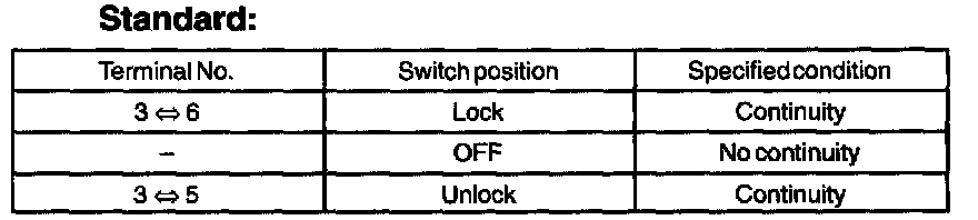 Inspect the door lock control switch continuity, as show in the illustration and table.