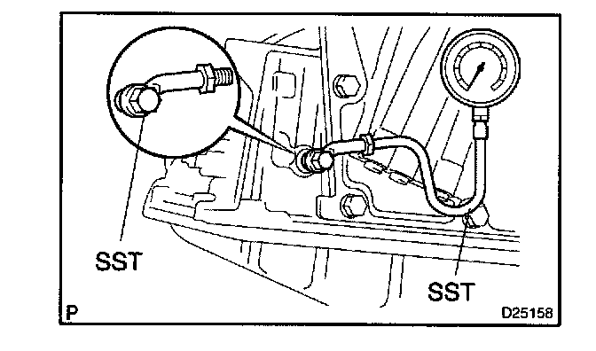 2. Remove the test plug on the transaxle case front left side and connect SST.