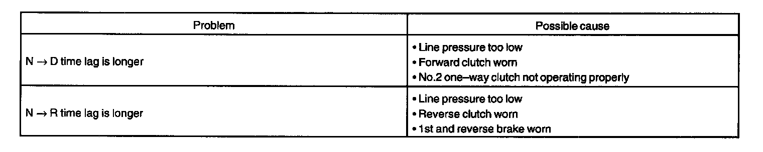 When the shift lever is shifted while the engine is idling, there will be a certain time lapse or lag before the shock can be felt. This is used for checking the conditions of the No.2 one-way clutch, reverse clutch, forward clutch, and 1st and reverse brake.