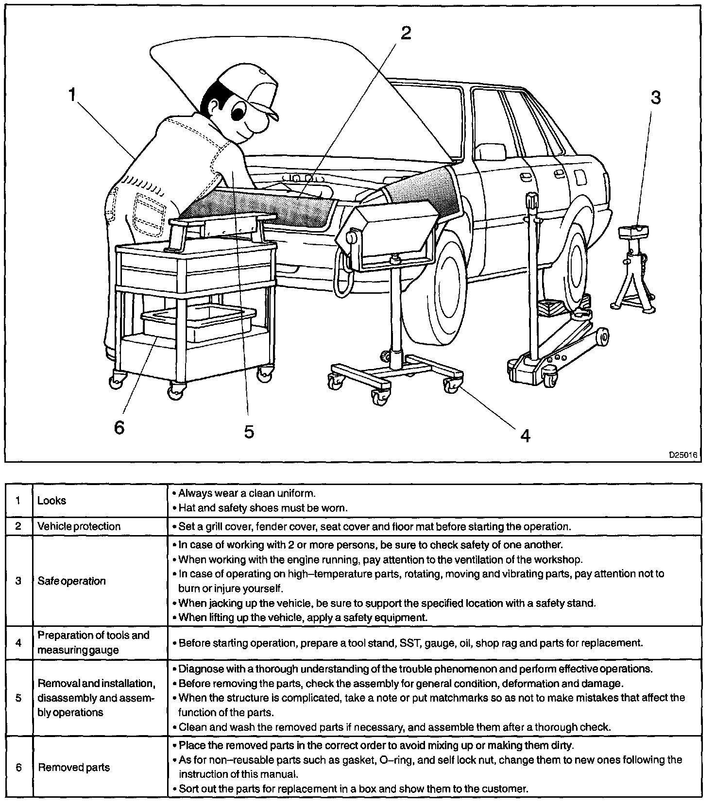 1. Care must be taken when jacking up and supporting the vehicle. Be sure to lift and support the vehicle at the proper locations.