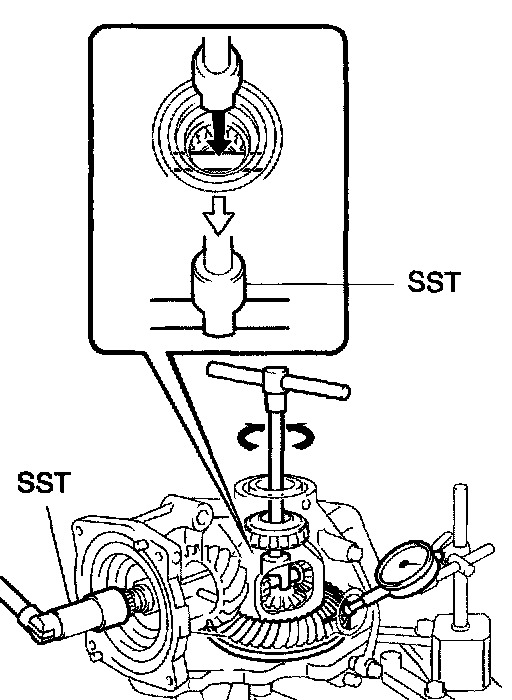 a. Using SST and a dial indicator, measure the backlash of ring gear while holding the drive pinion.