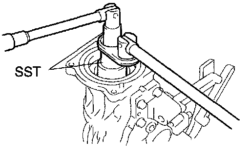 b. Using SST to hold the drive pinion, remove the nut.