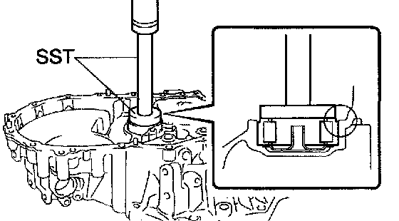 b. Using SST and a press, install a new FR differential case front tapered roller bearing (outer race) with shim to the transaxle case.