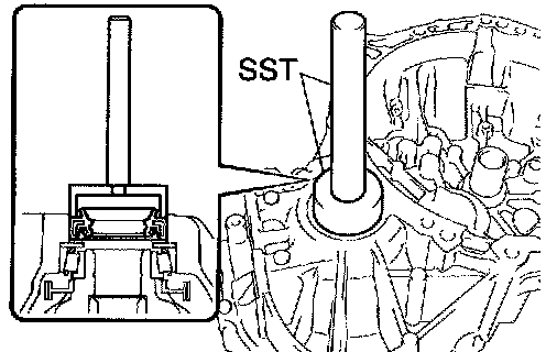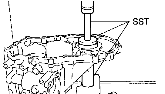 a. Using SST, remove the FR differential case front tapered roller bearing (outer race) and shim from the transaxle case.