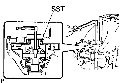 c. Using SST and a torque wrench, turn the differential case assy to the right and left 2 or 3 times to allow the bearings to settle.