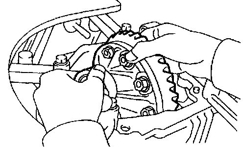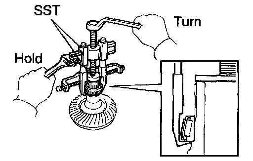 ^ Even if the tightening torque of gear nut exceeds the specified torque, if the preload is not enough, loosen the gear nut once and apply rust preventive oil or gear oil super to the gear nut and to the screw or bearing surface of driven pinion. Then do the procedure again. If the tightening torque is smaller than the specified value, replace the pinion bearing spacer with a new one and adjust it.