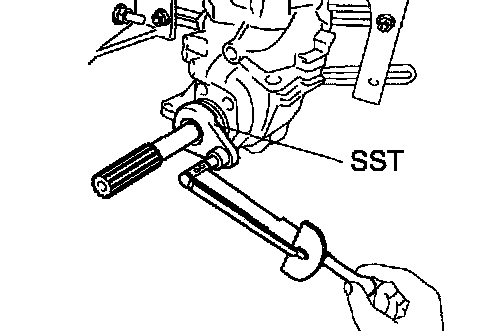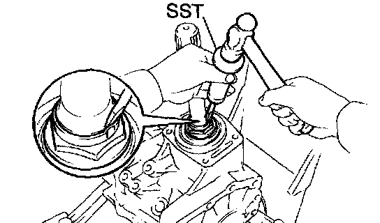 a. Using SST, a screwdriver and a hammer, remove the transfer output shaft spacer No. 1.