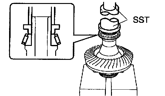 d. Using SST and a press, press the ring gear mounting case LH inner race into the ring gear mounting case.