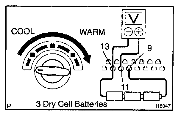 c. Connect the positive (+) lead from the tester to terminal 12 and negative (-) lead to terminal 13, then check that the voltage at each dial position, as shown in the chart.