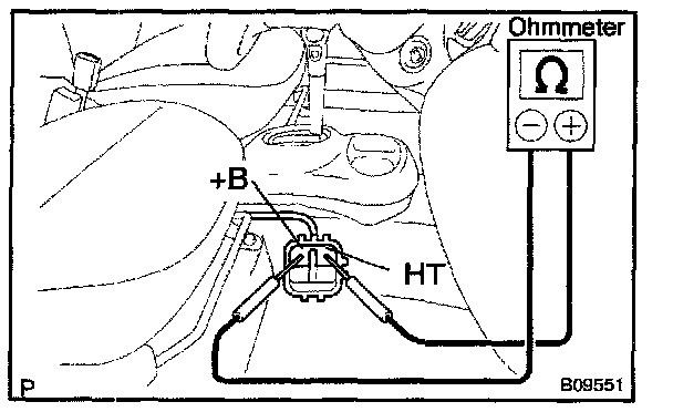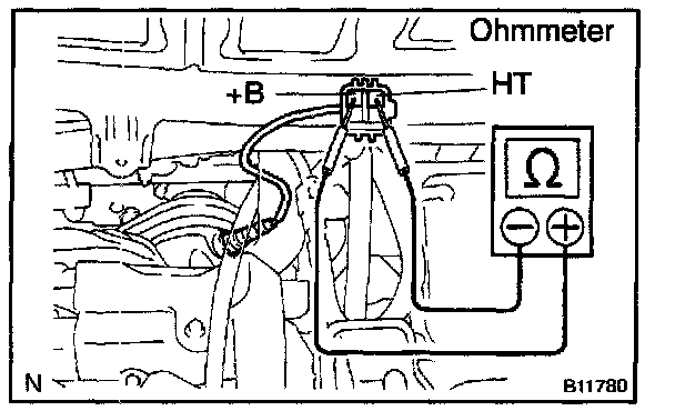 b. Using an ohmmeter, measure the resistance between the terminals +B and HT.