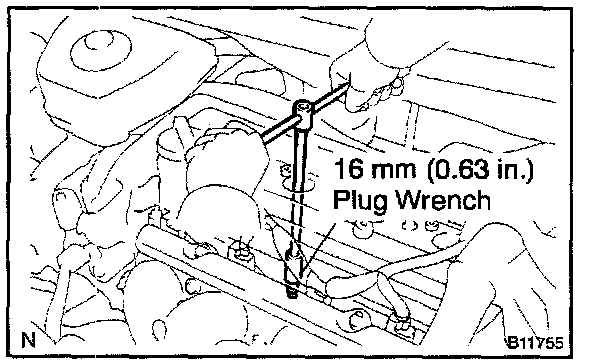 2. Using a 16 mm (0.63 in.) plug wrench, remove the spark plugs.