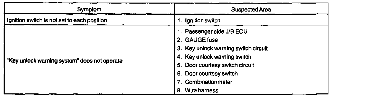 Problem Symptoms Table - Ignition Switch And Key Unlock Warning Switch: