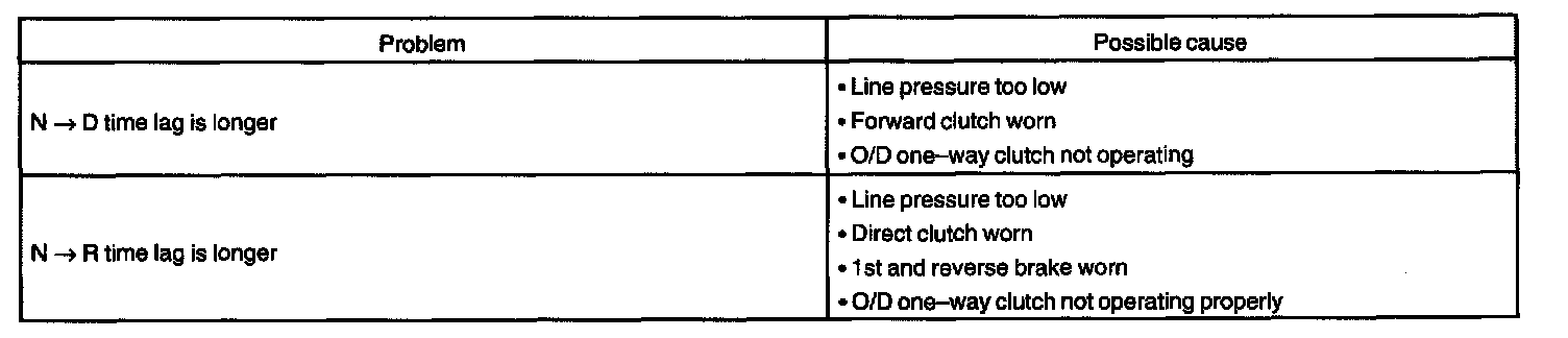 When the shift lever is shifted while the engine is idling, there will be a certain time lapse or lag before the shock can be felt. This is used for checking the conditions of the O/D direct clutch, forward clutch, and 1st and reverse brake.
